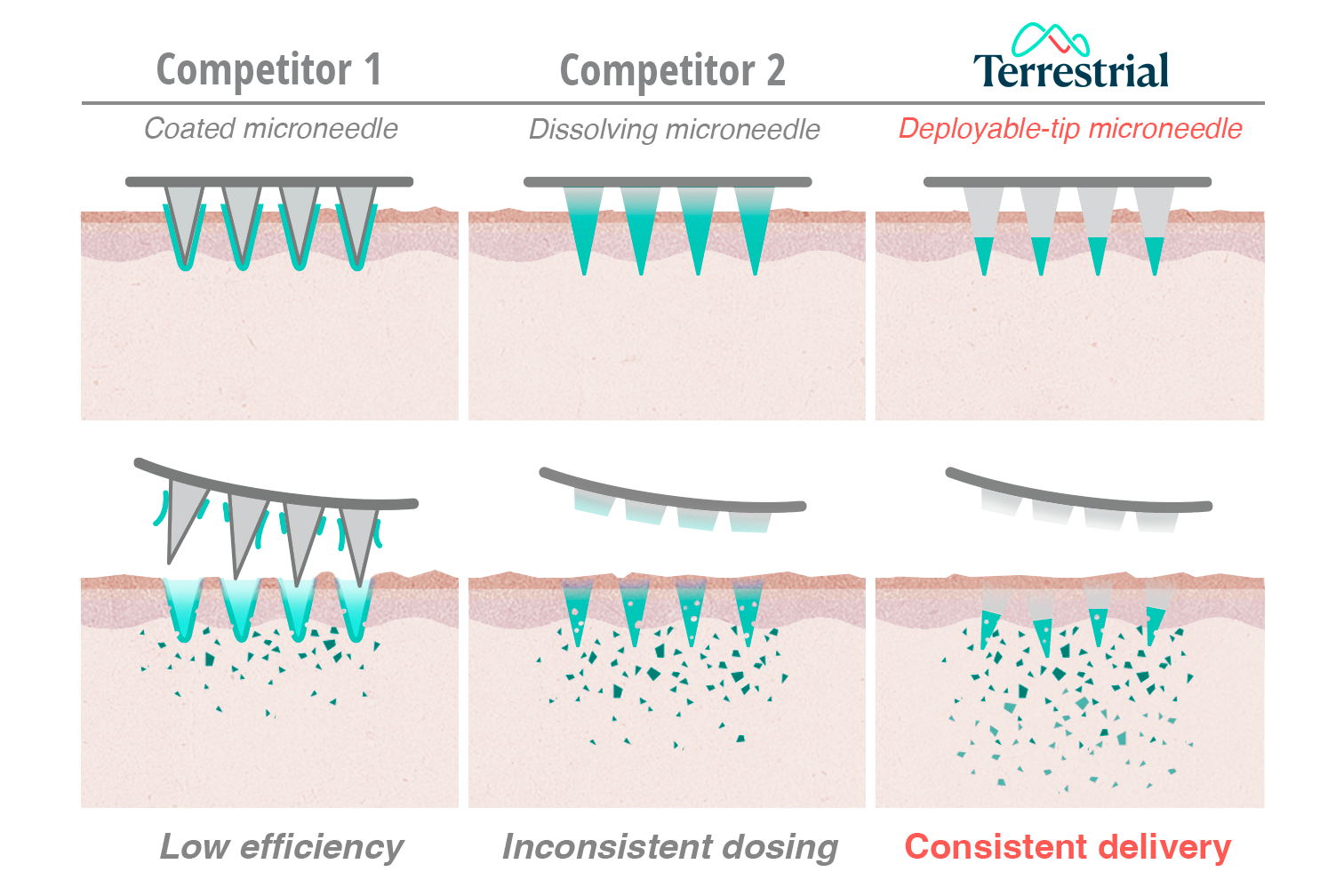 The MAP platform’s biggest strengths and primary points of differentiation are consistency and flexibility. Terrestrial’s in-house GMP manufacturing accommodates variable array sizes, enabling the platform to deliver a wide range of payloads and doses. Dissolving tips delivered with an applicator allow the MAP platform to deliver doses more consistently and effectively than competition.